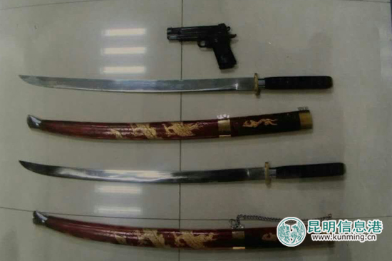 陈某等人使用的砍刀和仿真枪 记者合宇聪/摄