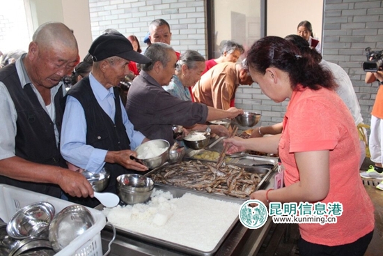 十一点半,食堂准时开饭,老人们拿着盘子、大碗有秩序地排起了队。这天的菜是富有官渡特色的煮血旺、煎鱼、红烧肉、老奶洋芋和鸡蛋汤。围坐着圆桌,吃着可口的饭菜,老人们脸上绽放出惬意的微笑。眼前一幅“老有所养、老有所乐”的温暖景致格外动人。