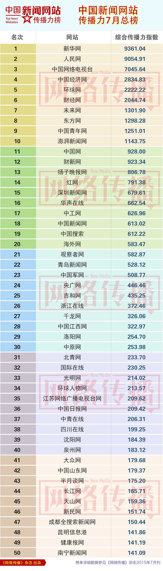 据悉,“中国新闻网站传播力6月总榜”发布之后,引起各界关注,杂志也得到多方反馈,为求榜单更加科学完善,榜单在现有的基础之上,积极改进传播力考察指数,除继续采用Alexa、中青华云等权威数据外,还引入ChinaRank数据指标,并细化加入微博、微信两个单独榜单。“7月榜”统计时间为2015年6月16日至7月15日,客观反映了国家网信办许可和确定的250家互联网新闻信息服务单位在该阶段的网络传播效果。
