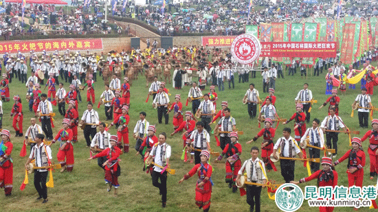昆明信息港讯 记者杨雁 实习记者李莹 8月8日13点,2015中国石林国际火把狂欢节在石林长湖民族文化体育广场盛大开幕,来自石林县各个乡镇街道的彝族等各少数民族身着盛装,齐聚一堂,大家跳起欢快的舞蹈,与四面八方的游客共同庆祝这一年一度最盛大的彝族传统节日。据悉,本次石林国际火把狂欢节预计吸引15万人来到石林。