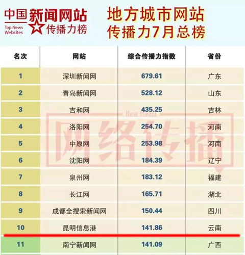近日,中国新闻网站传播力七月榜单新鲜出炉,昆明信息港综合传播力跃居中国新闻网站第48位,居全国地方城市网站第10位(其中,昆港微 信传播力居全国第6位,微博传播力居全国第22位),系云南唯一进全国50强榜单的网站。