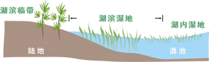 最靠近水面的湿地称为湖内湿地,一般是指水淹没4米以内的水域内湿地,目前有1.12万亩,主要是由各种水生植物所覆盖。湖内湿地往外延伸的部分是湖滨湿地,就是指滇池沿岸这一块,近水低洼的区域,水深多为几十公分至一米之间,这个区域以草本植物、耐水植物为主,还有少量的中山杉等乔本植物。再往外是湖滨临带,这个区域以中山杉、柳树等乔本植物为主,这样就构成层次错落的乔、灌、草的植物群落结构。