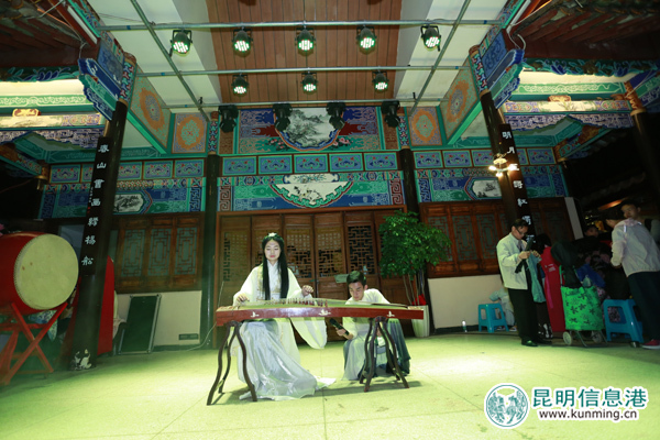 傍晚时分,翠湖拾翠滇文化中心院内热闹非凡。数十名参与演出的汉服男女正在戏台上为节目做准备,上百名身着汉服的姑娘则跪坐在院内摆放整齐的垫子上,而姑娘们的周围里三层外三层挤满了市民和游客,他们纷纷举起相机,留下汉服美女的倩影。