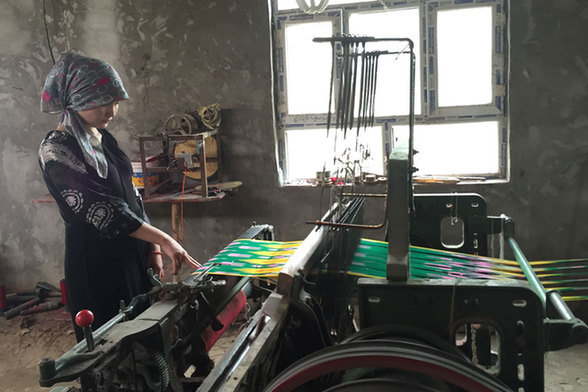 一位妇女在新疆和田市吉亚乡的家庭传统手工作坊里生产艾德莱斯绸。中国日报网 记者毕楠摄