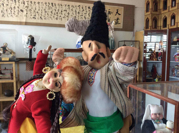 工艺美术大师单秀梅用艾德莱斯布料制作的手工布塑。单秀梅/摄