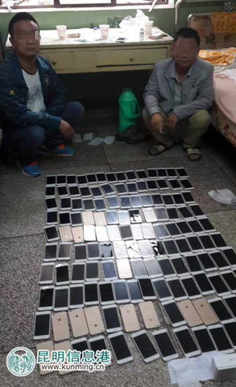 昆明信息港讯 记者合宇聪 相信不少市民都遇到过这样的经历,走在街上,会被偷偷摸摸的人搭讪,“要手机不,便宜”。此时,你可千万别以为天山掉馅饼了,你便宜买来的手机有可能根本不是手机,而是——一块废铁。8月31日上午,昆明市公安局便衣侦查分局民警就成功端掉一个“废铁iPhone6”的团伙,在嫌疑人租住的房间内,民警查获“废铁iPhone6”140余部,而每一部“废铁iPhone6”价值仅为10元。
