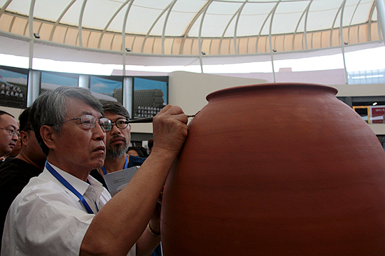 中国陶瓷艺术大师李梓源等23位国内外陶艺大师分别在纪念缸上签字留念。记者栗飞/摄