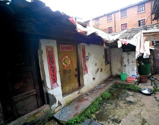 可这是一个怎样的房子?低矮、破败,院中杂草丛生,被四周怪异的碉楼式楼房包围。许是房顶漏雨,住户用许多五颜六色的塑料袋盖在上面,用砖头压住,远看像一堆垃圾在风雨中摇摇晃晃。