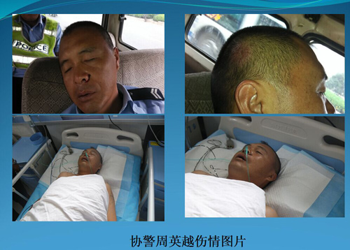 周英越被送往云南省第二人民医院,医生诊断为“头骨骨折、颅内蛛网膜出血”。据市交警支队宣传处全俊鹏处长介绍:“协警周英越被击打的部位位于左侧耳朵上方,被送进医院,一直在重症监护室抢救。3日晚苏醒了一下,神志不太清楚,目前依然处于半昏迷状态中。另一位协警潘贵下身被踢踹,手机也摔坏了。”