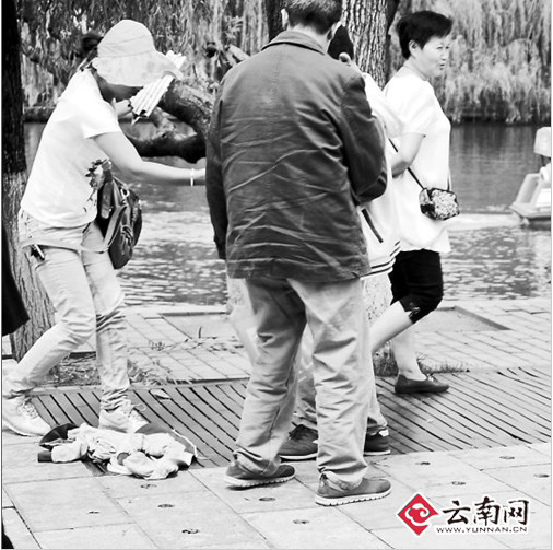 2011年,《昆明市公园管理条例》开始实施,规定对随地吐痰、便溺、乱扔垃圾杂物的,将处以10元以上50元以下罚款。但据翠湖公园管理处工作人员介绍,拿到执法证后,公园一直在以劝阻为主制止不文明行为,收效甚微。有市民建议:去翠湖的游客中,几乎人手一相机、手机,可发动游客拍下不文明行为,及时发送给公园管理方,通过园区广播、显示屏或者微信等方式曝光。(春城晚报 记者张勇)