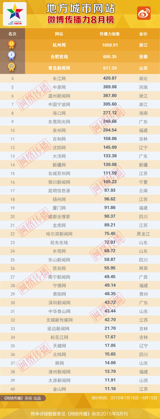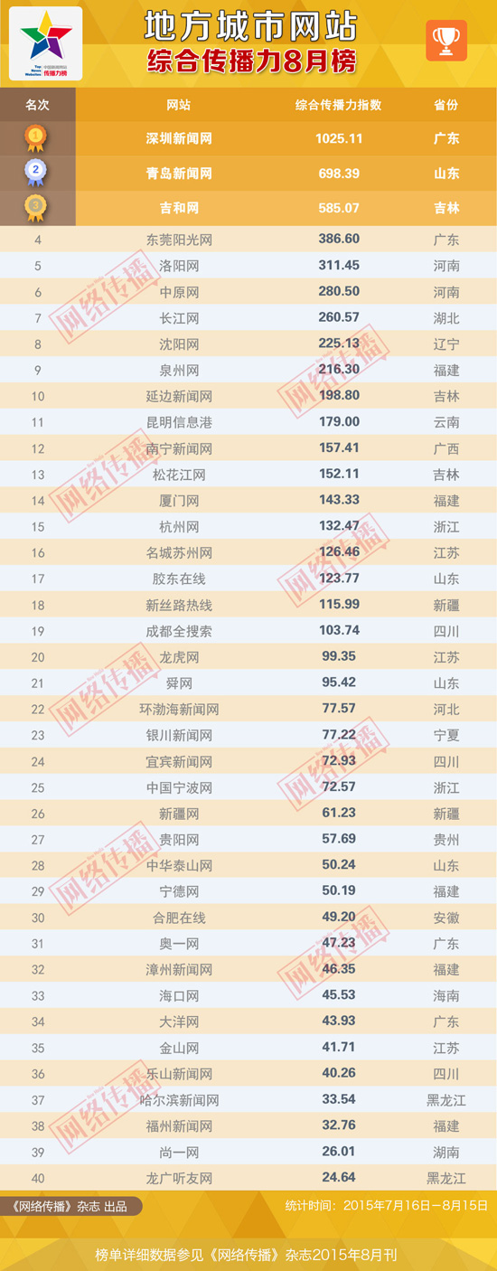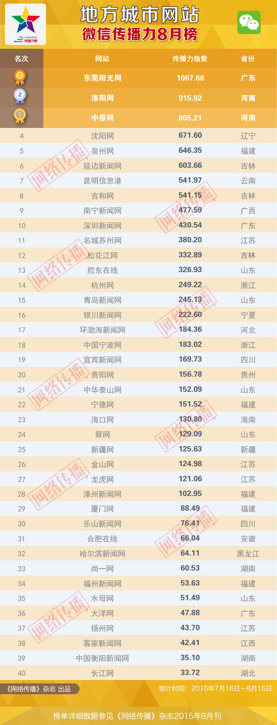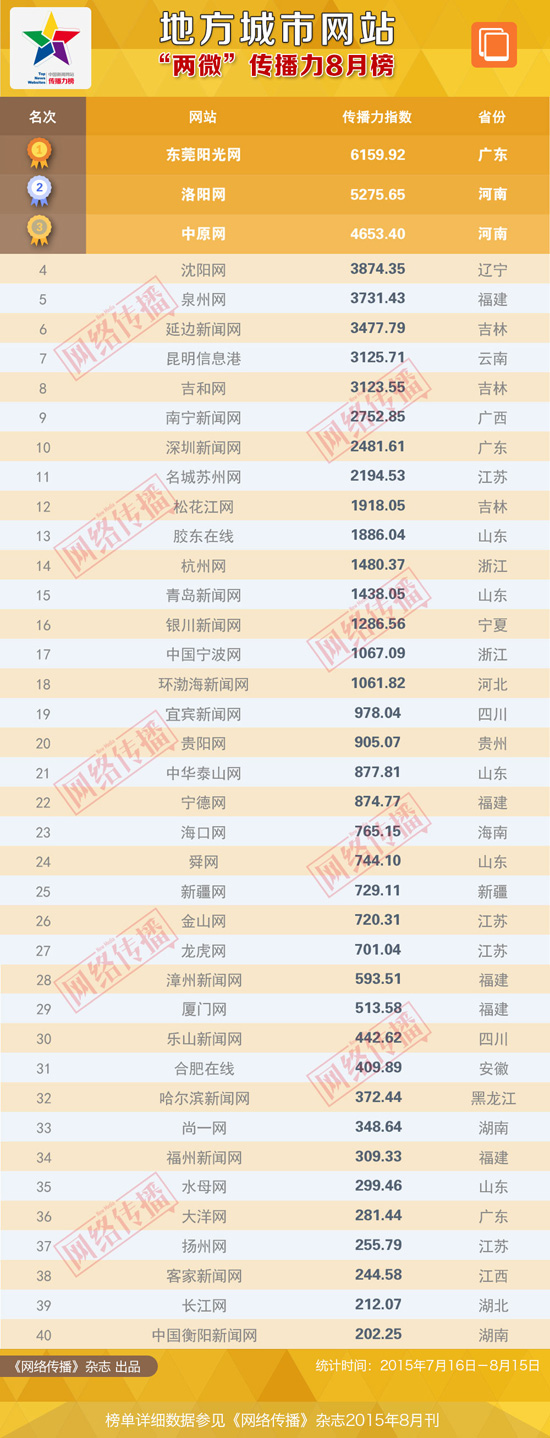 同期公布的榜单还有“地方城市新闻网站排行榜”。继7月份上榜之后,昆明信息港再次上榜,跃居全国地方城市网站总榜第11位,系云南唯一进入该榜单的新闻网站。其中,昆明信息港还名列该榜单“两微(微博微信)”传播力榜单第7名,微信传播力榜单第7名,微博传播力榜单第17名。