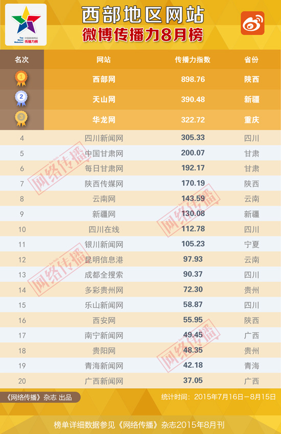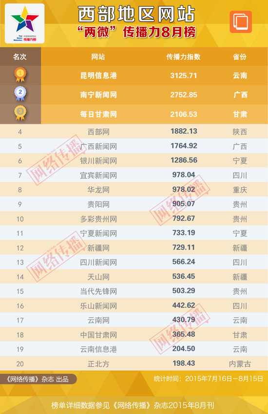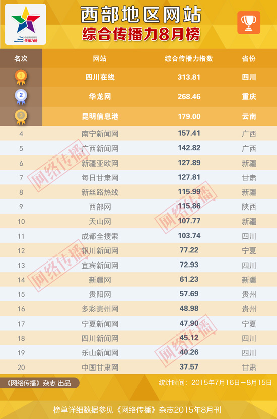 “西部新闻网站传播力榜”是《网络传播》杂志首次涉水区域性传播力排行榜,根据中国新闻网站传播力榜参数对西藏、四川、重庆、云南、新疆等12个省市新闻网站进行排名。四川在线、华龙网、昆明信息港分别跻身中国新闻网站传播力榜西部地区8月总榜前三甲。