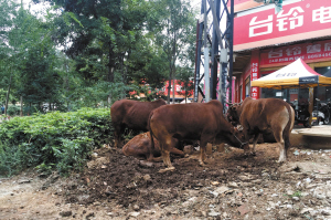 12日上午,在该餐馆正门右侧5米处的绿化带里,有5头黄牛被拴在一根电线杆边,有的站着,有的悠闲地躺着。黄牛所占的位置,面积约5平方米,被踩得坑坑洼洼,几堆牛粪不时散发出一股臭味。
