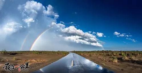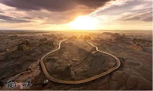 新疆魔鬼城总是给人凄凉萧瑟之感,然而天地交接的斜阳明亮而耀眼,赋予大地一层温婉的色彩,蜿蜒的公路,如一条玉带从光明中缓缓走来……
