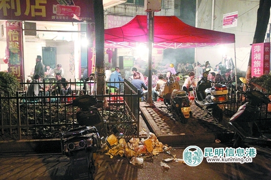 昨日凌晨1点,盘龙区新兴路与新迎路口的灯光微亮,安静的夜晚只听得见汽车的引擎声。这与11日凌晨截然不同,此前,这里摆着十来家烧烤摊,各种吃食在烧烤架上冒着烟,而吃夜宵的人们正忙着品尝烧烤。昨日,这里已没有了小贩的叫卖声,也没有冒着烟的烧烤架,更没有熙熙攘攘的食客。