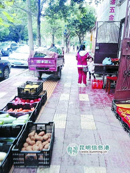 下午2点30分左右,佴家湾路口停着四五辆电动车,车主正忙着招呼过往的行人乘车。记者11日看到的占道经营车辆和摊位已经减少了大半。但在距离路口10米左右的两个生鲜店门口,依旧堆放着装蔬菜的塑料筐和各种蔬菜。相比11日满地都是蔬菜的现象,人行道被占用的程度已经减轻了不少。