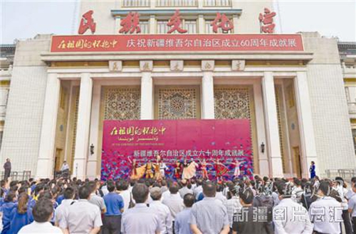 9月20日,演员在新疆维吾尔自治区成立60周年成就展上表演。