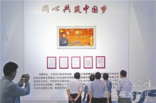 新疆亚欧网讯(记者杨维汉、胡浩) 《在祖国的怀抱中——新疆维吾尔自治区成立60周年成就展》20日在北京民族文化宫开幕。两名维吾尔族姑娘向中共中央总书记、国家主席习近平敬献的“同心共筑中国梦”绣匾在展览中展出。