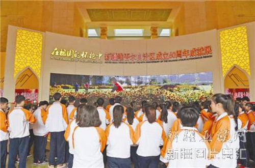 9月20日,学生们参观新疆维吾尔自治区成立60周年成就展。(图片均由记者陈晔华/摄)