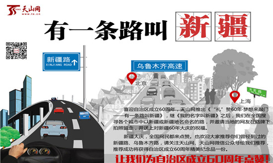 新疆60年大庆,全国网民都来点赞。也欢迎大家推荐你们曾经到过的新疆路、乌鲁木齐路,请关注天山网、天山网微信公众号推荐,推荐成功将获得自治区成立60周年精美纪念品一份。