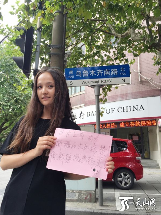 从朋友那里得知,天山网在面向全国征集祝福语,她给天山网发来她和女儿在上海乌鲁木齐路的照片。“我在上海祝福家乡,希望新疆和谐稳定,繁荣富强。”她说。