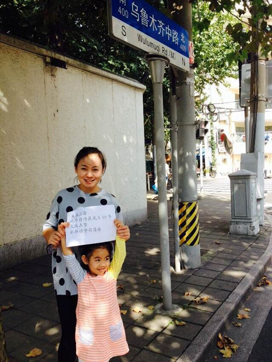 马丽洁和女儿一起,在上海市乌鲁木齐路,为新疆60年大庆送祝福。(图片由受访者提供)