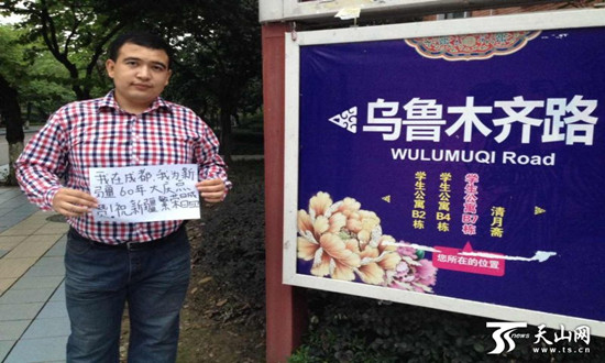 热甫开提·阿力木江,西南民族大学学生,在成都市西南民族大学内的乌鲁木齐路为自治区大庆送上祝福。(图片由受访者提供)