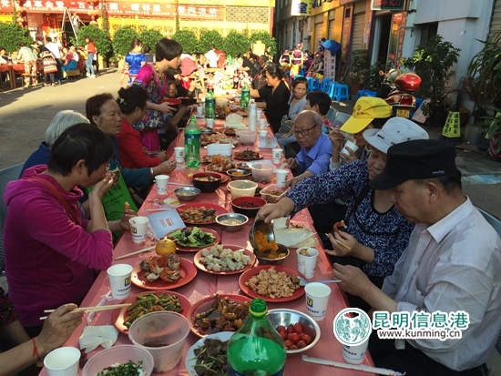 昆明信息港讯 记者栗飞 通讯员郭武辉 俗话说“远亲不如近邻”,在如今的城市里,隔重门户如隔重山,隔层楼板如隔层天。以往住平房和家属院的“邻里一家亲”感觉让人怀念。而在太和街道和平路社区,居民们找到了这种久违的邻里情。在国庆佳节到来之际,社区200多位居民摆起了百家宴,邻里乡亲们聚到一起,共话邻里情。