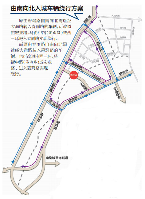而原由春雨路自南向北需途经大渔路转入碧鸡路的车辆,也可改道由西三环、马街中路(苏南路)或宏业路、进入碧鸡路实现绕行。