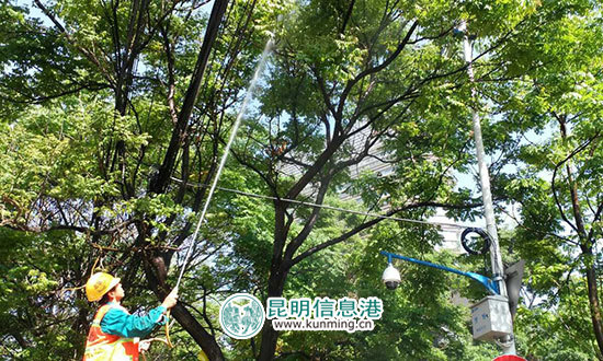 人民中路,绿化工向行道树上喷洒药剂。资料图片