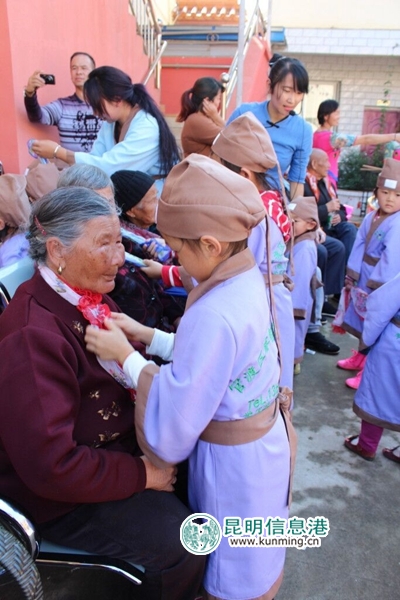 昆明信息港讯 通讯员熊楠 张云洪 熊艳玲 给爷爷奶奶系上一块丝巾,为他们捶捶腿、敲敲背,让他们感受到如同家人一般的温暖。日前,官渡区睿智宝贝幼儿园的孩子和青年志愿者们走进矣六敬老院,以自己独特的方式为老人们送上诚挚的祝福和问候。