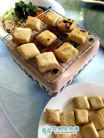 服务员端上了云南招牌小吃——建水烧豆腐,为了让嘉宾们能领略最正宗的烧豆腐,餐馆特意安排服务员教大家吃烧豆腐,可有的嘉宾等不及了,迫不及待地抓起一块生的豆腐就放在嘴里,还边吃边说“好吃。”这让以前来过云南,知道烧豆腐怎么吃的嘉宾和服务员觉得好笑。再经过一阵翻烤后,豆腐的清香渐渐弥漫开来,此时,吃生豆腐的嘉宾才恍然道,“原来还能烤熟了吃啊!”于是大家相视而笑,一同品尝云南美食。