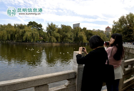 活动临近结束,嘉宾在翠湖边观赏海鸥并拍照留念。记者王莹摄