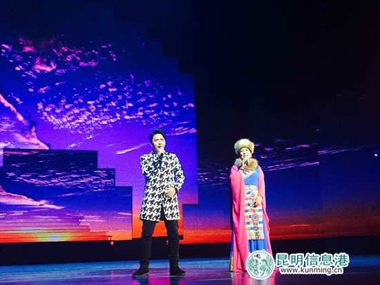 云南省著名歌唱家宗庸卓玛与其儿子扎西顿珠倾情歌唱《北京的金山上》。记者徐毅杰摄