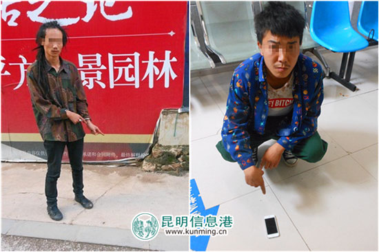 当两名犯罪嫌疑人正在所上接受调查的时候,莲华所又接报被害人蒋某(男)报警称,其和朋友陈某在经过本市五华区教场北路一工地门口时,被两名男子拦了下来,两名男子用干粉灭火器和扳手将被害人蒋某以及陈某打伤后又抢走蒋某的一部白色苹果手机。据受害人蒋某描述,两名男子骑一辆白色电动自行车,骑车的男子是个矮个子,短头发,穿蓝色衣服,戴一顶灰色的棒球帽;后座上的男子个子高,留着几股辫子,穿黑色衣服,背一个黑色双肩包。