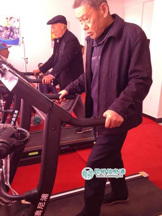 社区老人在练习使用跑步机