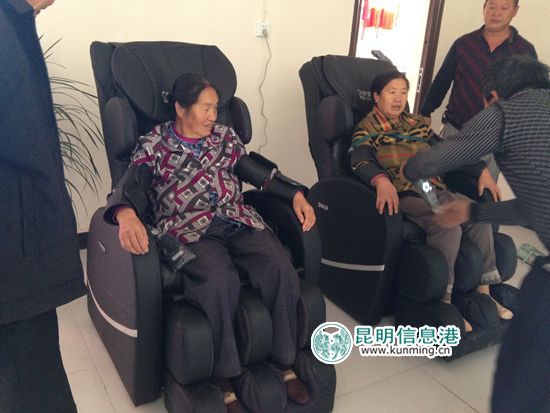 工作人员指导老人们使用按摩椅