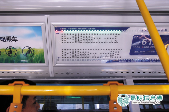此外,车内的电子导乘牌也格外引人注目。行驶过的站点,都显示呈红色,每到一个站,都有报站。跟地铁内导乘牌一样,这样市民可以更加准确掌握车辆路线和到站信息。