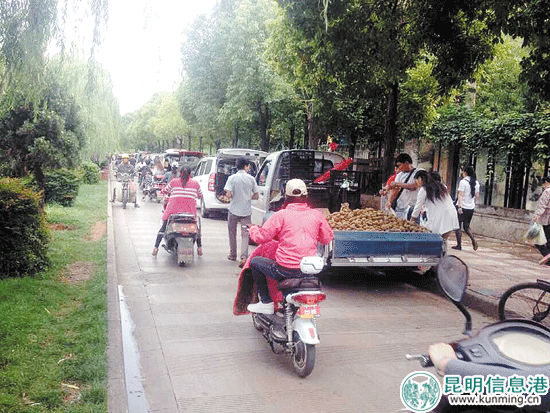 此路段附近有居民小区,设有公交车站台(时代风华小区康乐茶文化城站),人流量很大,到下午五点以后这里都特别拥挤。每当有市民停下脚步在车旁选购时,这条非机动车道基本上就“无路可走”,大家只得放慢速度艰难地行驶。被堵在路边的小王说:“我每天上下班骑电动车最怕经过的就是这里,一两分钟的路程要走十多分钟。占道经营已经严重影响到了交通秩序,“我们也知道摆摊会影响交通秩序,但是这里人流量大,我们把车停在这里能多做一些生意。”其中一名摊贩表示。