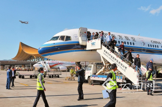 中国民航局发布的最新统计数据显示,10月份旅客吞吐量千万人次(含)以上机场放行正常率排名中,昆明长水机场位居全国第一;旅客吞吐量千万人次以下机场放行正常率排名中,西双版纳机场位居第一。图为长水机场航班起降。(云南日报 记者 杨峥摄)