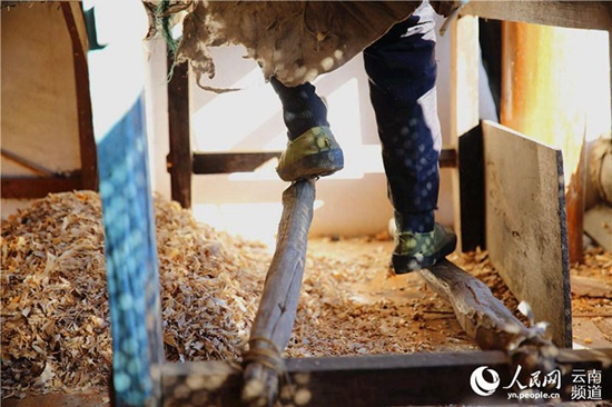 郑映海老人操作机器打磨伞骨 记者薛丹/摄