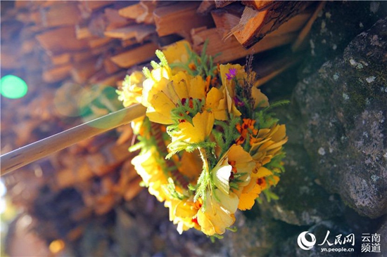 用银杏叶和鲜花做成的头圈 记者薛丹/摄