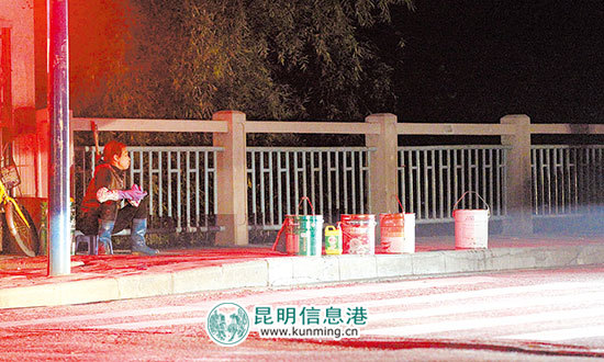 当晚9:40,记者来到江岸小区盘龙江边,只见岸边放着6大桶水,水桶边站着一个吆喝洗车的人,旁边担着毛巾、洗衣粉等工具。只要有汽车路过,这人就吆喝起来:“来洗车啦,10块、10块!”