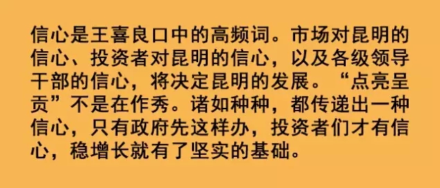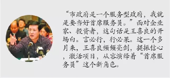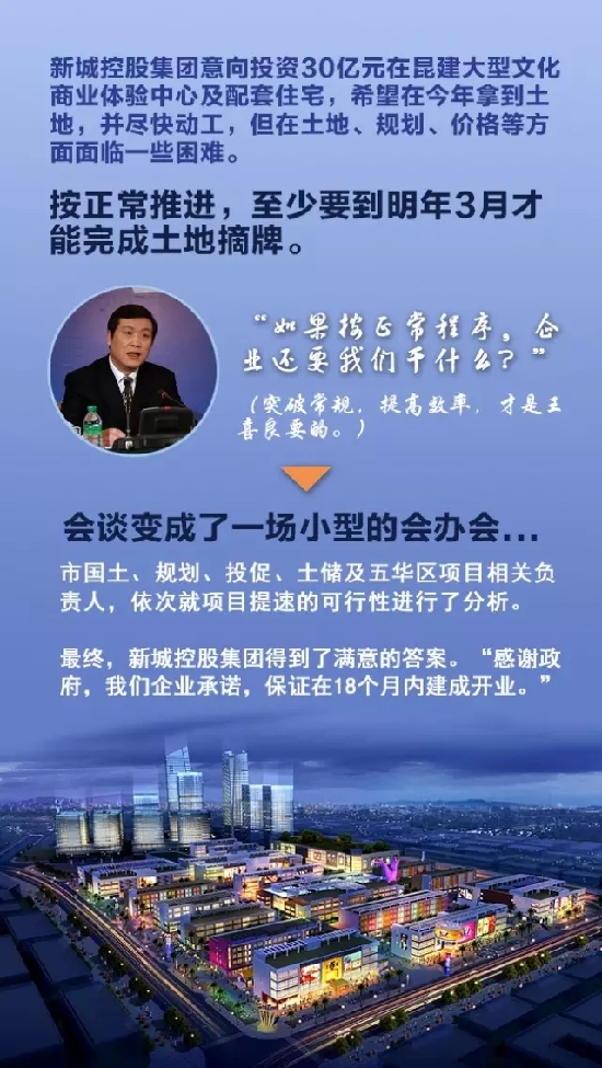 不仅如此,王喜良还给市政府秘书长定了个规矩:凡是有实力的企业家来昆明投资兴业,需要见面的,务必于3天之内安排,白天不行,就晚上,不论多晚。实在没有办法分身,也必须给企业一个正式回复,明确会面的时间。