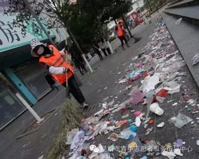 一片狼藉堆成山:金碧广场很受伤,南屏街被抹花了脸。平安夜后的金碧广场变得“面目全非”;地面变成了“大花脸”,绿化带里留下了数不清的脚印,娇艳的花朵被踩得东倒西歪。此外,草地、树上、栏杆、灯杆上也全都无一幸免,被喷上彩色泡沫喷雾……忙碌的环卫工人,他们用扫帚扫,刷子刷,还用木棍掏被彩条堵住了的下水道——往年都是到凌晨五点,环卫工人终于为这场狂欢买完了单。