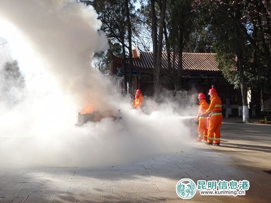当天在公园近华浦区域,一堆不明物体忽然起火,并散发出滚滚浓烟,旁边执勤点的保安立即疏散周围游客,并通过对讲机向公园治安保卫科汇报了发生时间、地点等情况。火势发展很快,火苗瞬间蹿起四、五米高,公园义务消防队用备用灭火器先进行灭火。不一会儿,西山区消防大队官兵赶到现场,用大量灭火器一起灭火,火势得到控制。火苗熄灭后,消防人员又用高压水枪对起火点进行降温冷却,整个过程有条不紊。