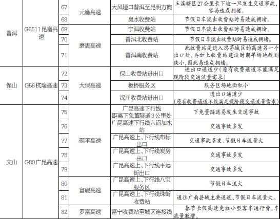 2016春节长假即将来临,探亲回家、走亲访友、务工返乡、休闲旅游等人流、车流增多,交通流量将急剧增大,春节期间国家还将继续实行7座及以下小型客车免收通行费政策,加之可能出现的恶劣天气的影响,省交警总队对近年来春节、国庆长假期间各地高速公路容易出现拥堵的点段进行了排查梳理,汇总了82处易拥堵点、段(详见下表)。
