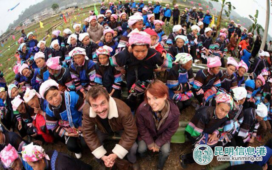 法国夫妇马丁玛丽到云南的一个农村游玩,与壮族村民合影留念。供图