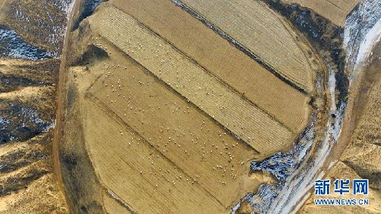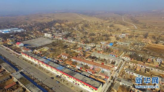 航拍向阳堡村。向阳堡村地处城乡结合部,是当地为数不多的比较平整的村子之一,村民的出行、吃水都比较方便,村子的人口也较多,如今也面临“年轻人流失”的问题。图上部分村后的老屋大多已经没人居住,人们把房屋翻盖在村南平整的土地上,从原先的窑洞改为砖房(2月10日摄)。梁鸿儒/摄