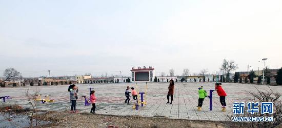 向阳堡村中央小广场,几个孩子正在广场玩耍。中央小广场是村子里举办庙会的地方,也是村子的“文化中心”(2月10日摄)。梁鸿儒/摄